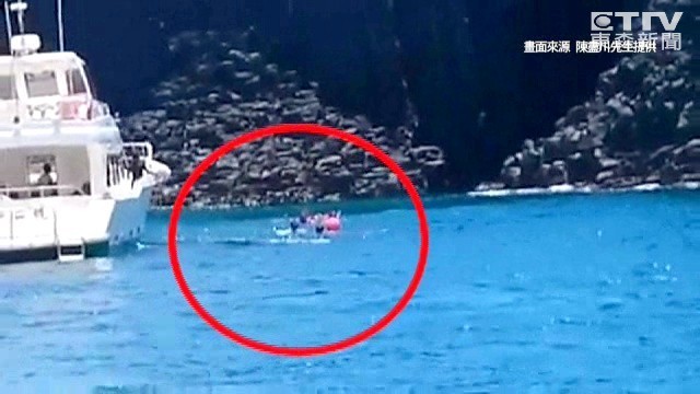拍攝的畫面中,海水不斷拍打著白色快艇,旁邊隱約可以看見幾名落水遊客飄浮在水面上,船員趕緊出浮球救人,目擊者指出,「一直流、一直流,他們都被帶去那裡了。」遊客接到浮球趕快抓緊,才順著浮球的繩子慢慢靠向快艇返回船上。