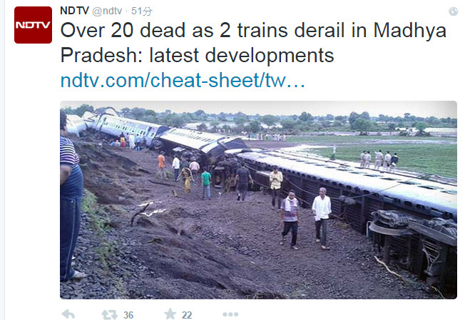 印度中央邦(Madhya Pradesh)4日晚上11時30分(當地時間)發生2列車出軌的重大事故,目前已知27人死亡,傷亡人數可能還會持續增加。鐵路發言人指出,可能是軌道淹水造成火車出軌。