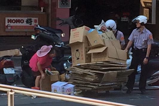 民眾6日上午經過土城學府路一段時,看到一旁的回收婆婆身邊跟著2名警察,原來他們正熱心幫著婆婆,2人分工合作,一人在回收車前指揮交通,另一人則是彎下身來替婆婆整理紙箱,溫暖的舉動都被一旁民眾拍下來,上傳到臉書。