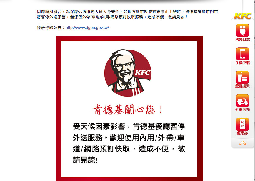 ▲颱風逼近,部分縣市宣布停班停課,肯德基已於官網公布停止外送服務。(圖/翻攝自肯德基官網)