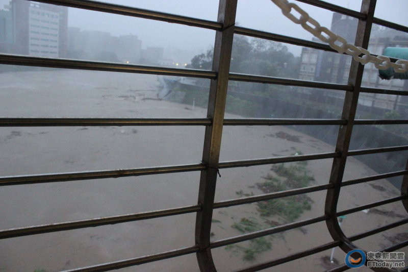 第三張、第四張照片則是拉遠,可看到畫面右方的腳踏車道引道旁柵欄似乎也被水沖毀。李姓網友表示,現在河裡什麼都有,路燈剩下不到半截,當時風聲非常尖銳,好像有什麼東西要衝入房子一般,打開窗戶後錄影10多秒後,風大到不得不關窗。
