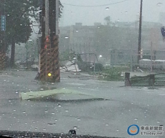 蘇迪勒挾強風豪雨襲台,各地陸續傳出災情,台北市8日清晨5時許出現13級陣風,狂風暴雨襲擊,許多路樹與招牌均被吹落一地,有民眾表示,清晨趕往上班途中,在八德路四段與東新街交叉路段,險被施工工地的鐵皮砸中,相當危險。