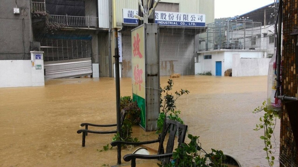 從照片可以看出,馬路完全被黃澄澄的雨水覆蓋,就像一大灘的泥水一般。許多店家也因為颱風關係將鐵門拉下,不過便利商店還是照常營業。提供照片是一家在三峽橫溪路上的一家橡膠工廠,可以看到不僅馬路淹水嚴重,連工廠內也受到雨水肆虐,紙箱都被沖的東倒西歪。