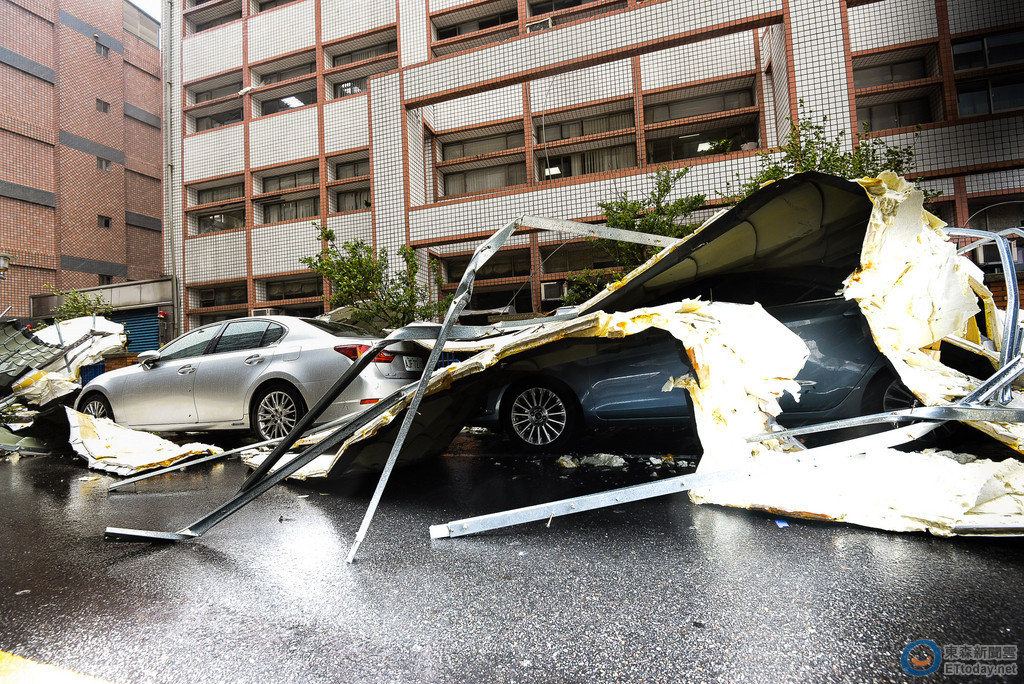 照片中可以清楚看到整片鐵皮屋頂掛在建築物上搖搖欲墜,往下一看更多散落在大馬路上,把盆栽壓倒事小,更慘的是還波及附近汽機車,有的車窗整塊破裂,還有好幾輛摩托車則像保齡球般被推倒。