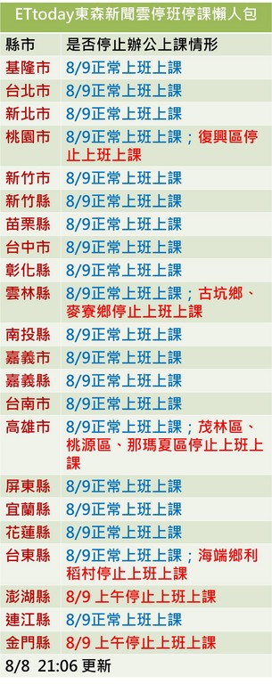 中颱蘇迪勒挾強風暴雨襲台,各地災情不斷,造成6死4傷上百人受傷,雖然颱風中心已出海,但海上、陸上颱風警報仍未解除,中央氣象局預估,將延後至9日凌晨台灣才會脫離暴風圈,目前本島地區幾乎已宣布9日未達停班停課標準,須上班上課,僅部分鄉鎮達停班課標準。《ETtoday東森新聞雲》即時更新整理全台停班停課狀況一覽表。