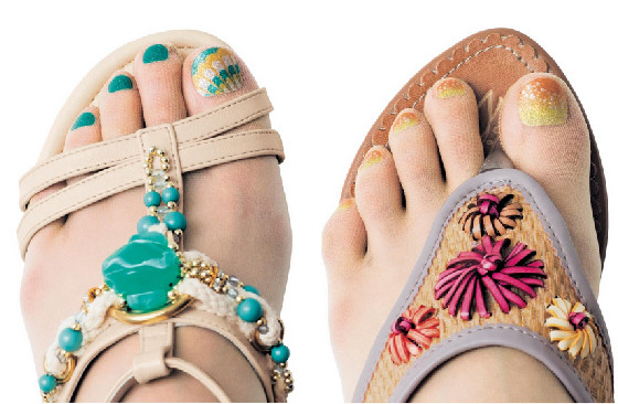 在台灣,除非工作需求,一般很少會穿到膚色絲襪。由於夏天女孩們會換上涼鞋或是夾腳拖等露趾鞋款,這時候更顯示出腳部指彩的重要,但如果臨時有約來不及塗上指甲油,日本推出的「指彩絲襪」(フェイクネイルストッキング)就派上用場啦!其實日本在去年就推出了一系列有指甲彩繪樣式的五指絲襪!穿上後,遠遠看腳趾頭,就像真的有擦上指甲油一樣呢!