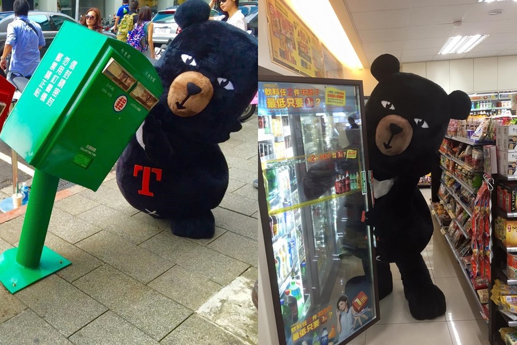 提供照片的網友表示,「喔熊」先是在一旁的7-11內「變裝」,再走到「歪腰郵筒」與民眾同樂。大概是郵筒推累了還是扶不正,「喔熊」接著回到小七吹冷氣、開冰箱挑飲料,一旁的阿嬤看到「龐然大物拔山倒樹而來」還嚇了一跳,畫面相當趣味!
