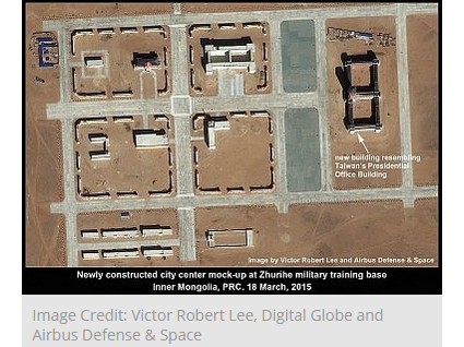 根據《外交家》網站9日刊登之文章〈衛星影像:大陸模擬入侵台灣?〉(Satellite Imagery: China Staging Mock Invasion of Taiwan?),作者李.維克特(Victor Robert Lee)引用「數位全球」(Digital Globe)和「空中巴士集團防衛與太空部門」(Airbus Defence & Space)的衛星照片,顯示解放軍位於內蒙古的朱日和戰術訓練基地,確實有著極為相似台北博愛特區的模擬建物,如果說這並非刻意仿製,那兩者的相似程度實在太過驚人。