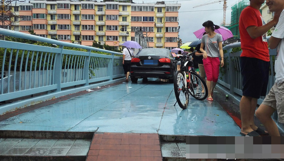 據報導,人行天橋兩端均為台階,中間為無障礙斜坡。附近店家表示,不少車被水淹,導致熄火動不了,那輛小車的車主挺聰明,開上天橋躲過一劫,他聽說車主是自己開上去,自己又開下台階走了,究竟怎麼上去,又怎麼下來的,他也不清楚。