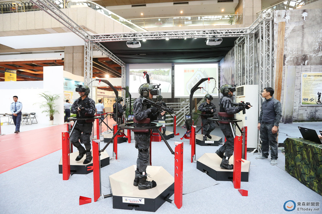 「模擬系統」展區中,最引人注目的就屬「沉浸式互動射擊模擬系統」,可見現場6人一組全副武裝,站在模擬機台上原地奔跑並相互溝通,一旁還有螢幕顯示戰場狀況,與網路戰鬥遊戲十分相似。