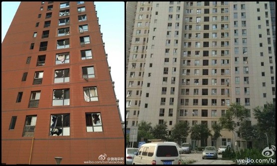 ▼距離爆炸1公里外的大樓,窗戶也無可倖免地被震毀。(圖/翻攝微博)