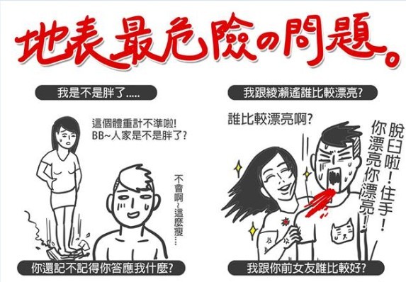 真的是壓力沉重!男人面對另一半時,總會被問到一些神秘問題,這時該怎麼回答,就亟需你的經驗和意志。插畫家「爵爵&貓叔」最近在粉絲團po出一張作品,完整揭露對於男生而言、可謂「地表最危險」的6個問題,內容極度有趣而引發討論。