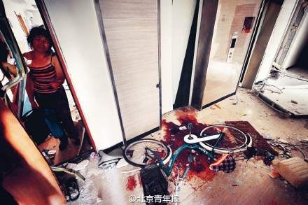 天津塘沽濱海新區一處貨櫃碼頭,12日深夜發生大爆炸,爆炸威力強大在30秒內引發2次「地震」,就連附近大樓的大門都被震倒。而離現場最近的一棟大樓,有一位居民在逃難時,不曉得被什麼落物砸重頭部,現場還留有血跡。
