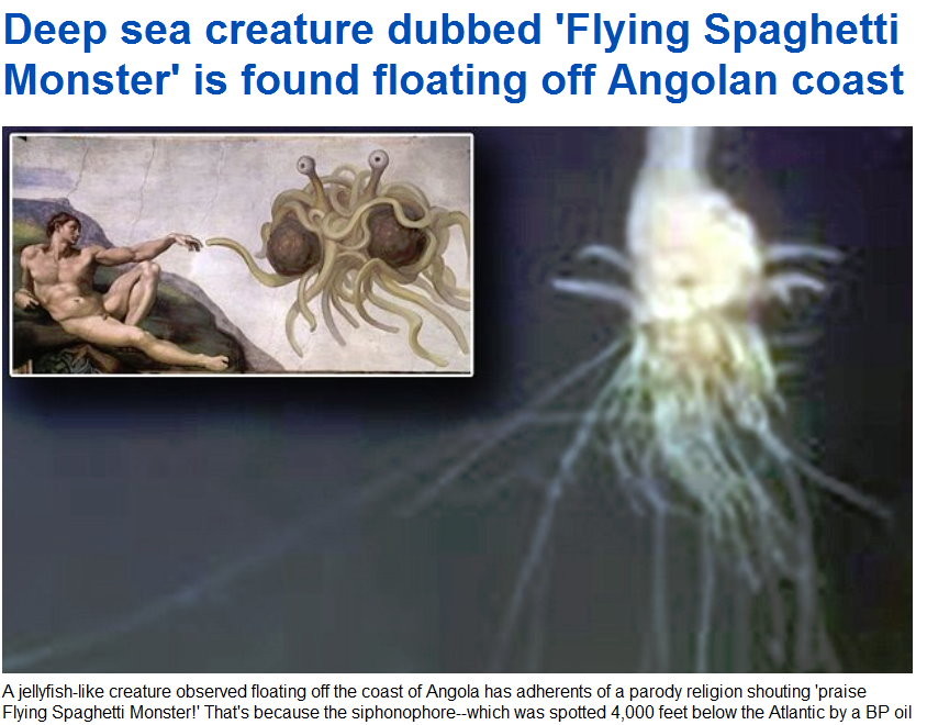 英國《每日郵報》報導,非洲安哥拉海岸附近日前驚見不明的深海生物,發現者把牠戲稱為「飛行的義大利麵怪獸」(Flying Spaghetti Monster)。