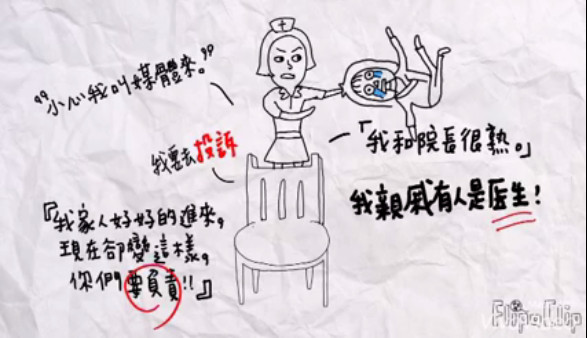粉絲專頁「咩姐」8日PO出一篇文章表示,這年頭醫護人員最大的壓力源是言語,是家屬和病人不間斷砲轟的言語,同時拍出KUSO影片,把「不友善」的病人分成15類,並整理出他們的經典語錄。