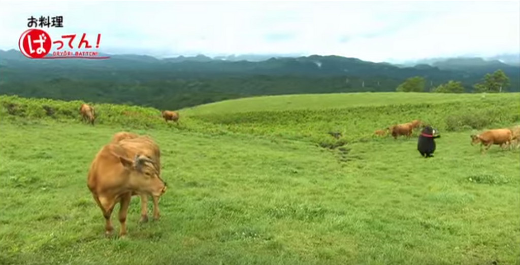 熊本熊這次要做牛丼料理,光是一開始來到牧場時,他就迫不及待要「追牛」拿來備料啦!只見圓滾滾的他在草坪上奔跑,一旁的牛卻很淡定,完全不理會他的走掉。可憐的熊本熊可是跑得氣喘吁吁呢。