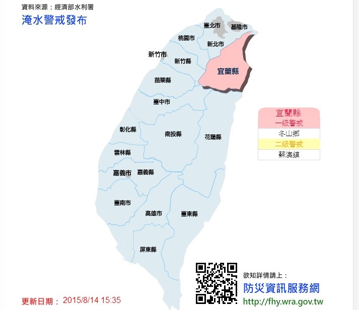 根據水利署最新發布淹水警戒指出,目前冬山站1小時累積雨量已達56公釐,其警戒範圍包括,蘇澳鎮龍德里、頂寮里、存仁里、蘇北里;冬山鄉補城村、武淵村、珍珠村、三奇村、太和村、八寶村、丸山村、安平村、香和村、大進村、中山村。