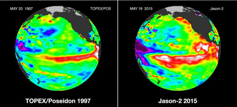 ▲左為1997年時高於平常的海平面溫度(紅色區塊)圖。右為今年的海平面溫度圖。(圖/翻攝自網路)