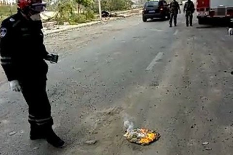 ▼一名消防員在殘留物上倒水,便冒出氣泡,發出「呲呲」聲,隨後燃起火苗、冒出白煙,且有較大的爆炸聲。(圖/翻攝自《新京報》)