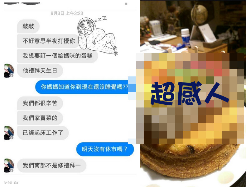 「敲敲咖啡」老闆PO出臉書對話,3日凌晨3點,收到一位客人的訊息,想幫媽媽訂做一個蛋糕,老闆回問:「你媽媽知道你到現在還沒睡覺嗎??」客人回答,「我們都很辛苦,我們家賣菜的,已經起床工作了。」老闆回問:「明天沒有休市嗎?」客人則說:「南部不是休禮拜一」。
