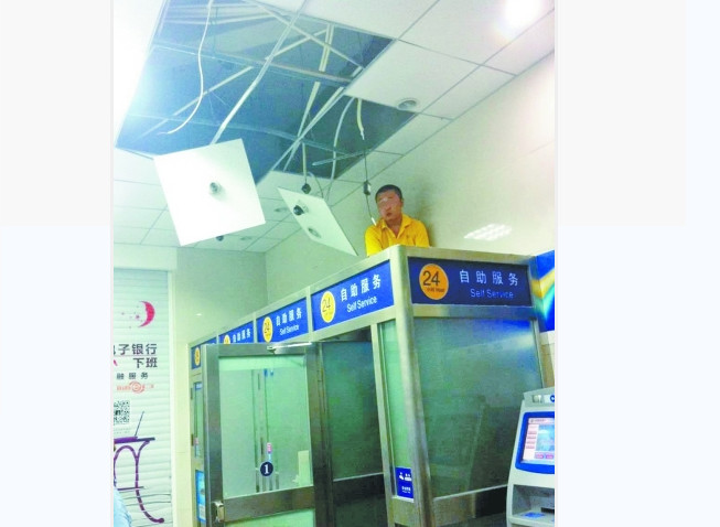 ▲男子疑似吸毒,爬到ATM機上非常躁動,還把天花板扯爛想逃出去。(圖/翻攝自《長江網》)