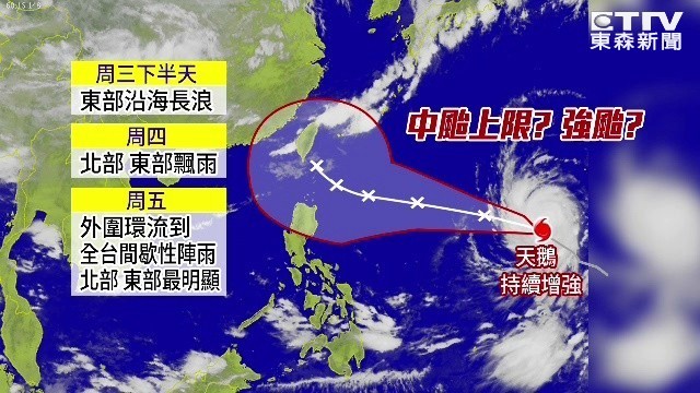 中央氣象局表示,今年第15號颱風「天鵝」已經是中度颱風上限,明、後(周三、周四)兩天不排除轉為強烈颱風,目前逐漸靠近台灣東部海域,預估周五21日開始,外圍環流會影響台灣的天氣,不過影響台灣的程度,還是要看颱風北轉的角度、以及與台灣的距離而定,提醒民眾提早做好防颱工作。