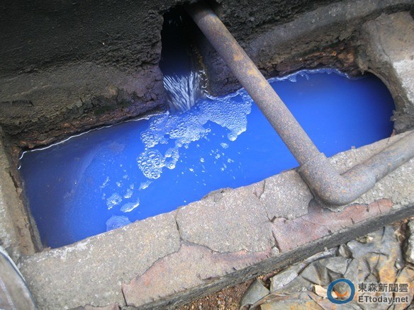 新北市樹林俊英街附近出現藍色的潭底溝,環保局稽查員沿著水路往上游追查,當場查獲違法印染工廠久華公司大量排出深藍色廢水,還散發出難聞、刺鼻氣味。目前,這間工廠已被告發並勒令停工。