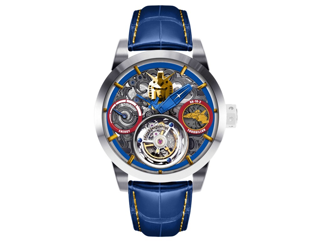 萬希泉透過自家鐘錶工藝,將鋼彈模型微縮於錶盤之上,以鋼彈經典的紅、黃、藍、白色系為主,並在12點鐘方向雕刻鋼彈頭巷,3點鐘、9點鐘方向設置鋼彈飛船浮雕與動力儲存指示,時、分針的造型為剛但專屬造型槍、盾,處處細節讓人著迷。搭載黃、藍撞色設計的鱷魚皮錶帶,飛船設計藍錶盒,酷味滿分;不只如此,價格也是陀飛輪錶款中的親民入門價,售價為NT$167,200元。