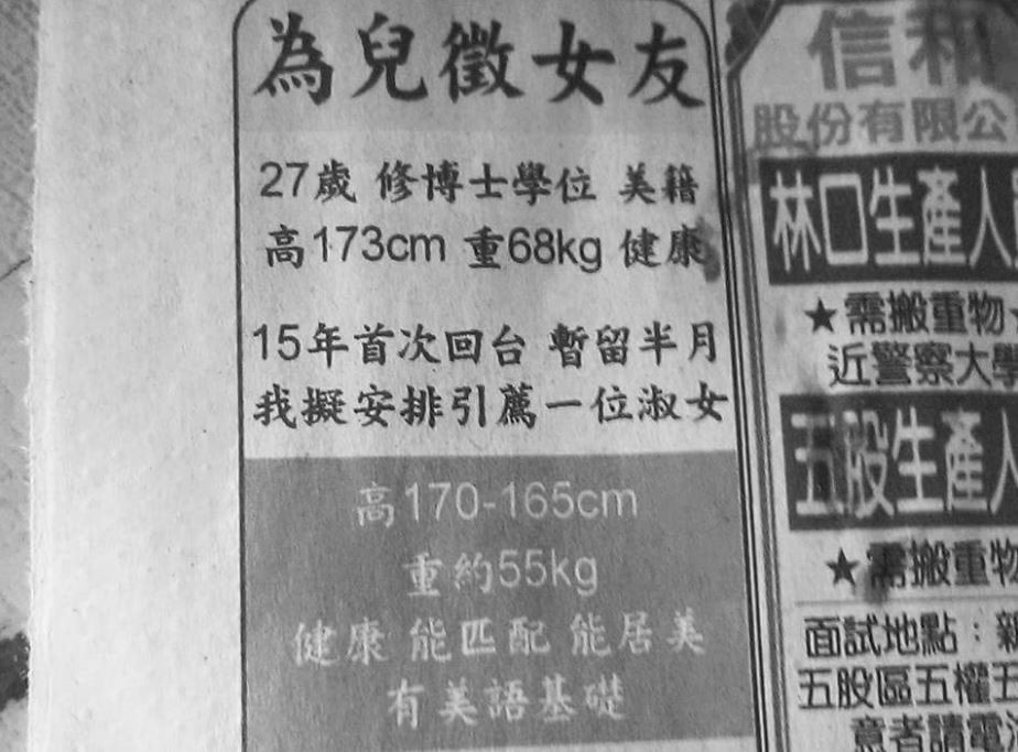 一張登報徵女友的照片引起網友熱烈討論,妙的是,這篇廣告是家長刊登的,內容寫道家中27歲修博士學位的美籍兒子,15年來首次回台,會留半個月,將打算安排一位淑女「幫兒子徵女友」。