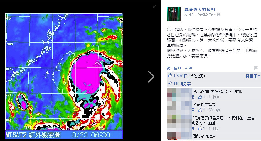 氣象達人彭啟明23日早上在臉書發文表示,「每天起床,我們得看不少數據及圖資,今天一早喝著自已煮的咖啡,在黑咖啡香味繚繞中,總覺得這張圖,有點噁心,這一大坨水氣,要是真來台灣,真的麻煩。還好沒來,大家放心,但東部還是要注意,北部雨勢比週六多。要帶雨具。」