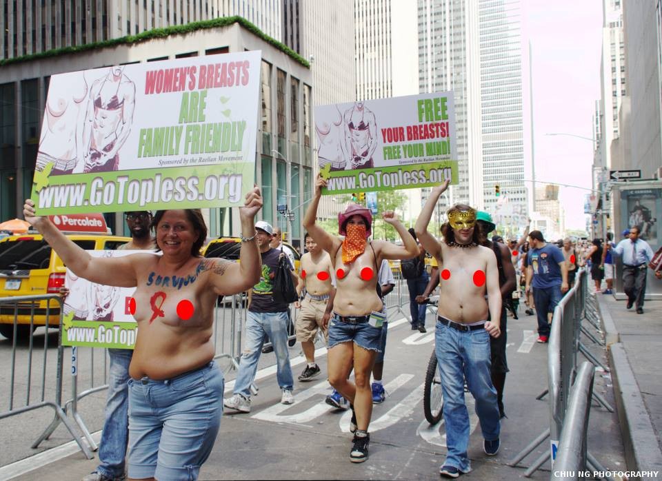 這場「上空」遊行超過300人參與,傑西表示,遊行的目的是要爭取裸胸性別平等的權利,另外也是抗議之前紐約市將彩繪裸體女子趕出時代廣場的事情,「自1992年以來,紐約一直是世界少數幾個城市在法律上承認婦女有裸露上身的權利。」