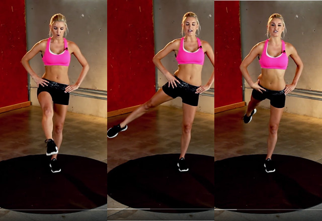 和動作三一樣,站立並且將雙手叉腰,首先先將右腳向前方抬起,維持一秒後,讓腳回到原位,再向旁邊抬起,一樣維持一秒之後回到原位,再向後抬,整套動作約維持40秒到50秒左右,再換另一隻腳。這個動作不但可以幫助瘦腿,也能夠練翹臀。