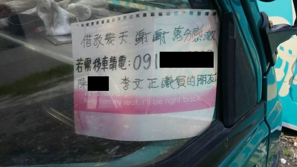 有網友在臉書社團「爆料公社」PO照,一輛汽車的門窗上貼著紙條,上頭寫著「借放幾天,謝謝,萬分感激,若需移車請電XXX」,乍看之下負責有禮,但最後一句卻指出自己是「李文正議員的朋友」,讓原PO質疑其用意是「不會被拖?」