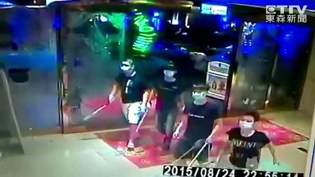 從監視器畫面可看到,一群黑衣人拿棍棒朝玻璃大門猛砸,門僮和2位客人嚇死了,立刻躲進店裡,只見黑衣人像發了狂似的在外頭砸玻璃和泊車櫃台,砸完後一群人往店內走,把所有玻璃門全都敲碎,有的還助跑增加攻擊力道,一群人逞兇40秒,隨即搭車快閃逃逸。