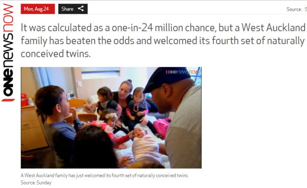 根據《紐西蘭電視台》(www.tvnz.co.nz)報導,這對來自奧克蘭的夫妻洛馬(Loma Uhila)和女子艾瑪(Emma Uhila),他們在2008年生下長子彌迦(Micah)之後,艾瑪接連在2010、2011、2013和2015年,4度產下雙胞胎,現在他們家中一共有9個小孩。