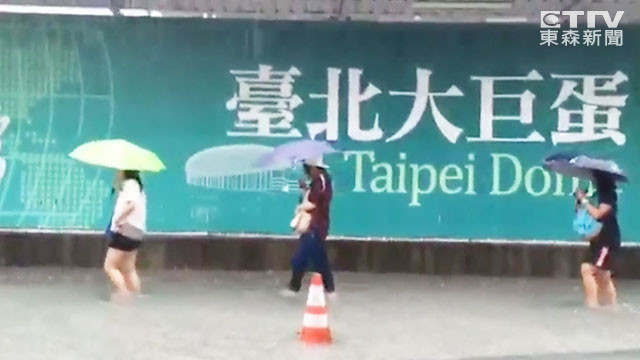 受低壓帶及西南氣流逐漸北移影響,台北市、新北市午後下起大雨,大巨蛋附近路段積水半個輪胎高,行人涉水而過,更見到男生背女友的溫馨畫面。