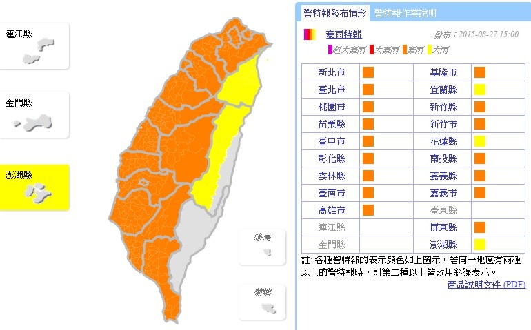 根據最新天氣警特報顯示,豪雨警戒區包括:基隆市、新北市、台北市、桃園市、新竹縣、新竹市、苗栗縣、台中市、彰化縣、南投縣、雲林縣、嘉義縣、嘉義市、台南市、高雄市、屏東縣;大雨警戒區包括:宜蘭縣、花蓮縣、澎湖縣。
