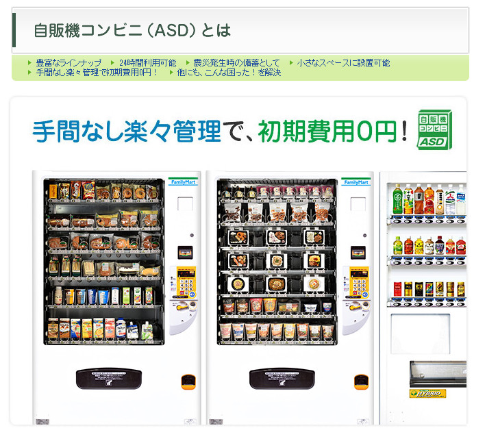 日本全家表示,目前已經有販賣60種商品的自動販賣機,種類包括義大利麵、沙拉和泡芙,每天會固定在午餐時間前補貨;對許多在高層辦公大樓工作的人來說,雖然在附近也有便利商店,但是要外出購買還是很麻煩,因此增加自動販賣機的需求。甚至就連地下鐵的車站內、高速公路的停車區等等也都設有自動販賣機。