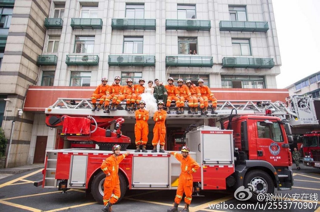 大陸杭州出現一對新人在消防局前面拍攝婚紗照,還有30多名消防員充當演員,引來眾多路人圍觀。