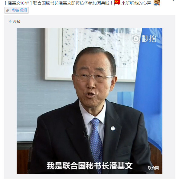 聯合國官方微博29日貼出一則影片,內容是潘基文以中文做自我介紹,並表示非常期待參加這次的紀念活動。
