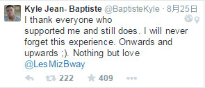 ▲演出期間,尚巴普提斯在推特上發表感謝,「感謝每一位曾經及仍然支持我的人,我永遠不會忘記這種經驗。繼續前進,不斷向上,心中只有愛。」(圖/翻攝自推特)
