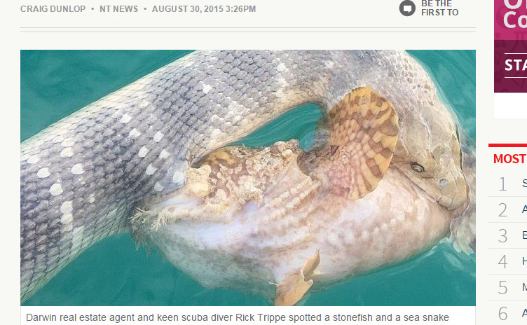 澳洲一名魚叉獵魚比賽冠軍特里普(Rick Trippe)近日在達爾文港(Darwin Harbour)附近海上,發現一個奇特畫面,一條海蛇跟石頭魚互咬的罕見畫面,身長近2公尺長的海蛇與石頭魚緊緊咬住對方不放,而這兩隻分別帶有劇毒的生物,最後可能因為中了彼此的毒後面臨死亡。