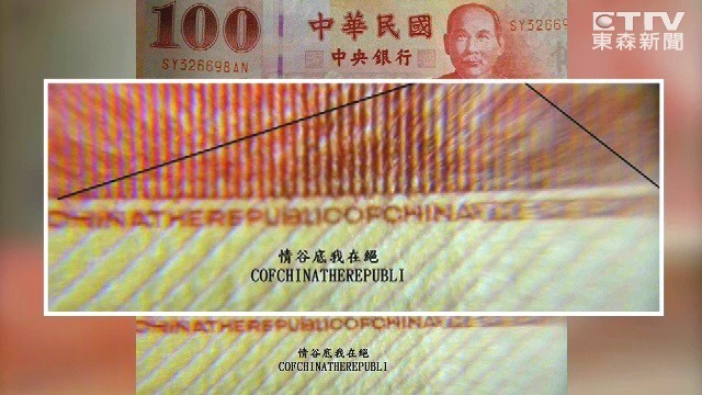 仔細看過100元紙鈔嗎?有網友po出新發現,紙鈔上竟然有隱藏密碼,不只有英文字母,還有一句武俠小說《神鵰俠侶》的台詞「情谷底我在絕」,不少網友都把鈔票拿起來仔細看,有人說有看到這行字,也有人說看不到,難道是假鈔?到底鈔票上有沒有這行密碼,鈔票的刻板雕刻師傅說,「中華民國」英文字。