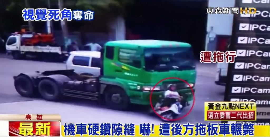 騎在大車旁真的要特別小心!高雄一名廖姓老翁1日騎車出門,鑽縫隙到拖板車的前方;何姓司機疑因視線死角,一路把人往前推,當場輾斃老翁。