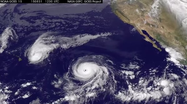 NASA昨日在YouTube公布一段衛星影像,並表示這是8月29日至9月1日在太平洋地區捕捉到的影像。短短35秒的影片可以清楚看到3個颶風「排排站」的奇特畫面,讓不少網友覺得十分壯觀,甚至還有網友想起電影《明天過後》的劇情。