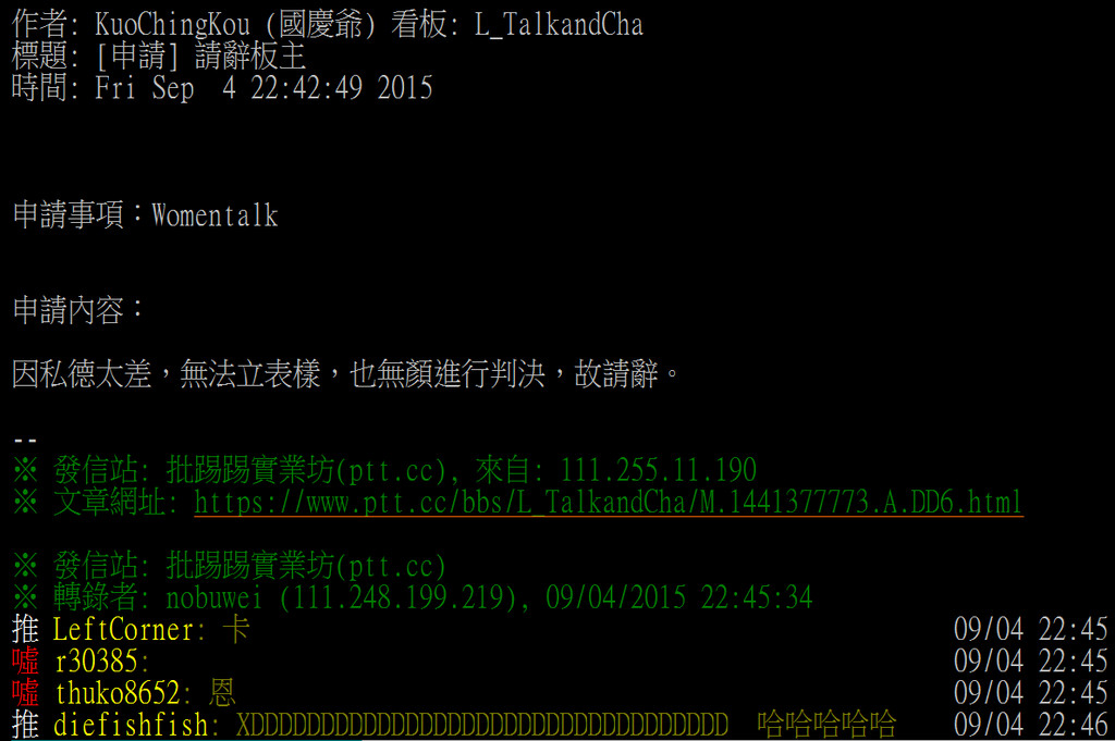 ▲女孩板板主國慶爺自稱「私德太差」請辭。(圖/翻攝自PTT)