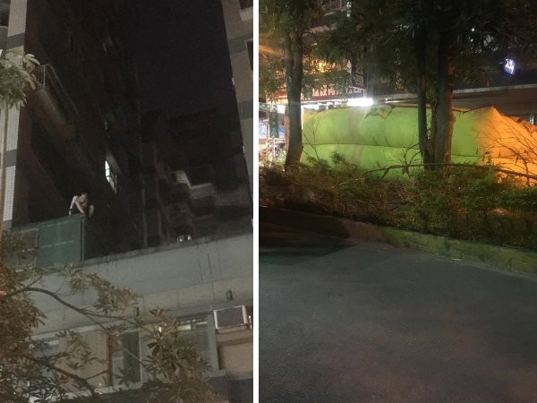 也有很多網友上傳照片到「爆料公社」直說「早上10點多過去他就在那裡了,都快12小時了」、「還沒下來?」、「充氣墊都想回家了」、「強制送醫」。