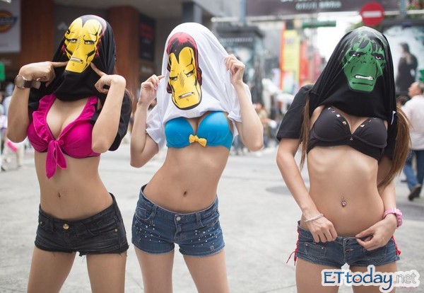 某潮牌業者推出了 一系列復仇者聯盟T恤,稱為「變身T」,在T恤的背面設計了像是面具的圖案,只要將整件衣服翻起來蒙住頭,就可以變身超級英雄!也請來多位辣妹示範如何「一秒變英雄」,令人不知道該將焦點往哪擺。