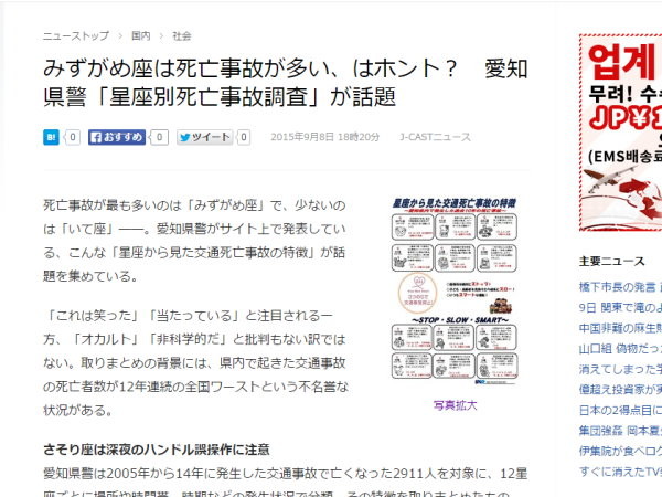 根據日本《livedoor NEWS0》網站報導,愛知縣發生車禍事故和死亡人數高居日本之首,而且持續12年;另外當地警方還做了一個調查,截至2014年為止,因車禍造成死亡的人數共2911人,其中死亡人數最多的是水瓶座,多達321人,其次是摩羯座。