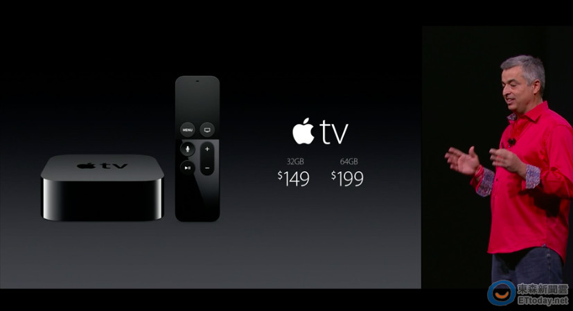 New Apple TV 採用 64 bit 的 A8 處理器,內建藍牙 4.0、WiFi MIMO 等傳輸技術,本身同樣提供 HDMI、網路傳輸孔介面,其遙控器內建觸控、聲控功能,預計 10 月底上市,共有 32GB 跟 64GB 兩種,售價分別為 149 美元、199 美元。